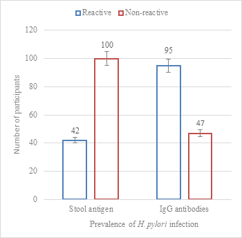 In the laboratory, several methods such as invasive (endoscopy and biopsy using modalities like culture, histology, polymerase chain reaction and rapid urease test) and non-invasive (fecal antigen testing, and serology) were performed for the detection of this global infection.14 For the non-invasive method, the stool test demonstrates the presence of antigens and active infection of bacterium while serology detects antibodies to H. pylori and serology must be carried out with Enzyme Linked Immunosorbent Assay (ELISA) kits (IgG) whose performance is greater than 90%15,16 However, serologic tests are limited by false positivity because of cross-reactions.17