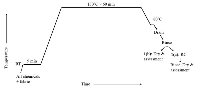 The process diagrams used for the one-bath one-step dyeing method are illustrated in Figure 1. Meanwhile, the process diagrams for the two-bath, two-step dyeing method are shown in Figure 2 and Figure 3. This study explores various process routes by either incorporating the reducing clearing (RC) step at different stages of the dyeing process or by omitting it entirely. These variations in the use of RC constitute the core experimental framework and comparative basis of the study.