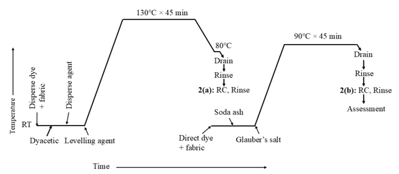 Experimental details: In this study, five different dyeing processes were employed to evaluate the dyeing performance of polyester-cotton (TC) blended fabric using disperse and direct dyes. The processes varied based on the bath configuration (one-bath vs. two-bath), dyeing sequence (one-step vs. two-step), and the application of reduction clearing (RC). These variations were designed to assess the influence of each parameter on color yield and fastness properties. The process details are outlined in Table 1.
