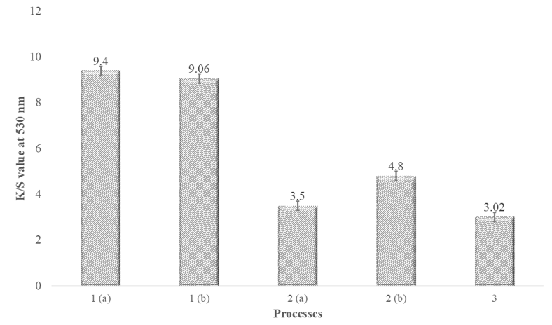 The color strength of the dyed samples was measured using a spectrophotometer at the wavelength corresponding to the maximum absorption peak, which occurred at 530 nm on the K/S curve. The color intensity is indicated by the K/S value at this wavelength. Process 1(a), a one-bath, one-step approach with reduction clearing (RC) carried out after dyeing, demonstrated the strongest color among the various dyeing processes examined, with a K/S value of 9.4. The slightly lower K/S ratio of 9.06 for Process 1(b), which used the identical dyeing procedure but skipped the RC phase, indicates that the RC treatment had a negligible impact on color strength in the one-bath approach.