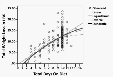 Partial correlation analysis indicated that there were significant correlations between total weight lost and average hunger [r (171)=-1.69, p=0.027] and average discomfort [r (171)=-.213, p=0.005] when controlling for average ketone levels. No correlation was seen between total weight loss and diarrhea or between total BMI loss and diarrhea when controlling for average ketone levels. Multiple regression analyses suggested a quadratic relationship between total number of days on the diet and total BMI lost F(2, 174)=26.00, p<0.001, and between total number of days on diet and total weight lost F(1, 145)=5.43, p=0.02. A summary of the analysis can be seen in Figure 1 & 2 respectively.