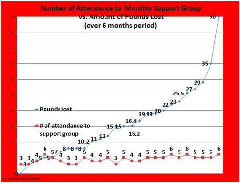 Based on the data collected, there was a positive correlation between the amount of weight loss and the number of attendance to the monthly support group meetings. Participants who attended regularly to the monthly support group meetings achieved greater weight loss than those who did not.