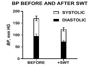 In conventional allopathic medicine, hypertension is treated via administering one or more established antihypertensive agents, individually or in combination therapy, with a goal of normalizing blood pressure toward 120/80 and body weights to a BMI of 30 or less.1–3,12,13 Combination therapy often also includes dietary, exercise, and lifestyle modifications. Among the medications employed are angiotensin receptor blockers (ARBs), and calcium channel blockers to bring about vascular smooth muscle relaxation and resultant vascular dilation, and a dose related reduction of vascular resistance. Adrenergic Beta-blocker agents can also bring about decreases in the sympathetic tone of vascular smooth muscles with corresponding effects on blood pressure. In addition, addition of diuretics such as hydrochlorothiazide as monotherapy or in various combinations can bring about renal sodium and water excretion, corresponding decreases in blood volume and reduction of diastolic and systolic pressures. The clinical pharmacologic effects and clinical outcomes of all traditional antihypertensive agents used in allopathic medicine are well documented, as are some potential untoward side effects that may accompany their use and reduce patient compliance accordingly.12,13 In the present review, the SWT regimen was administered, and systolic and diastolic blood pressures monitored periodically for 30 days or more to determine if normalization of blood pressure (BP) could be achieved and maintained in the absence of traditional pharmacologic agents. At the completion of the study, all participants achieved a normalization of a daily BP of 141/80 or less.