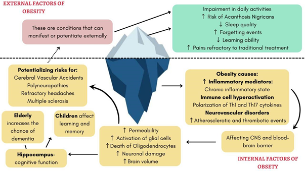 Therefore, despite the neurologic mechanisms of obesity not being completely elucidated, it is a fact that a hyperlipidic diet and an increased BMI have correlations with the release of inflammatory mediators that lead to the aggression of the nervous system - central and peripheral - through numerous mechanisms. The neuroinflammation stands out, which affects the hypothalamic pathway that controls satiety, the cognitive function since childhood until senescence and the peripheral synapsis, leading to sociofunctional related damages, respectively, with the maintenance of a greasy diet, difficulty in learning and in memory and polyneuropathies. Furthermore, it is also known that obesity leads to morphological and structural alterations of the nervous system and that this can also be associated to the cognitive decline in the obese individuals. Finally, even before the analyzed knowledge, it is necessary that there are scientific deepenings in the investigation of pharmacological, surgical and social lifestyle intervention mechanisms, aiming to better approach the control of the damaging effects of obesity.