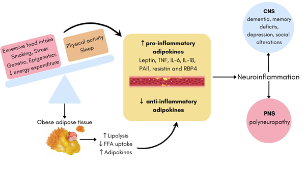 The peripheral nervous system has two divisions, the autonomic nervous system, which is subdivided in sympathetic and parasympathetic, and the somatic nervous system, which is subdivided in sensitive and motor peripheral nerves. In this division, there are regions that are not protected by the blood-brain barrier, differentiating from the regions of the CNS, for example, the autonomic nervous system and the sensorial ganglia, along with the non myelinated fibers and the terminations of the synapses of the PNS, therefore are vulnerable locations and exposed to the aggressive factors of the inflammatory pathophysiology of the adipose tissue.17,66–68