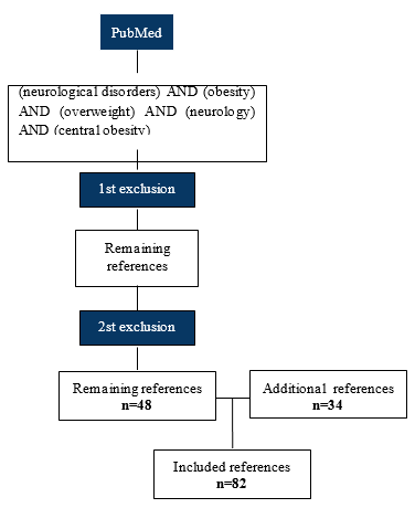A narrative literature review was conducted in the Medline Databases, from 2010 to 2022, on neurological disorders, obesity, overweight, neurology and central obesity. In the Medline, 154 articles were found by the Mesh descriptor “(neurological disorders AND obesity AND overweight AND neurology AND central obesity)”, of which 59 were selected, after the first set of criteria — exclusion of titles not addressing to the topic “obesity and/or neurological disorders”, articles not included in the search period 2010-2022, as well as non-English articles. The second set of criteria — exclusion of the abstracts not addressed to obesity or neurological disorders and of those in which the neurological disorder was the cause of obesity — was applied, by which 11 articles were excluded. Other articles that did not contemplate these conditions were excluded. To ensure content saturation, the authors checked the included research references and related reviews on topics to identify missing publications. Furthermore, 34 articles from the Medline Database were manually screened and added according to their relevance in the qualitative evidence synthesis. Of the total, 82 original articles remained.