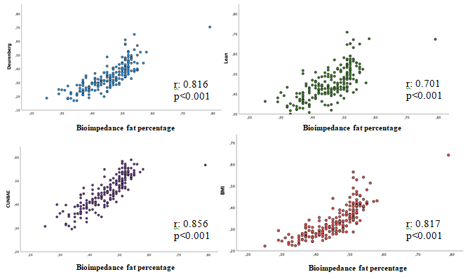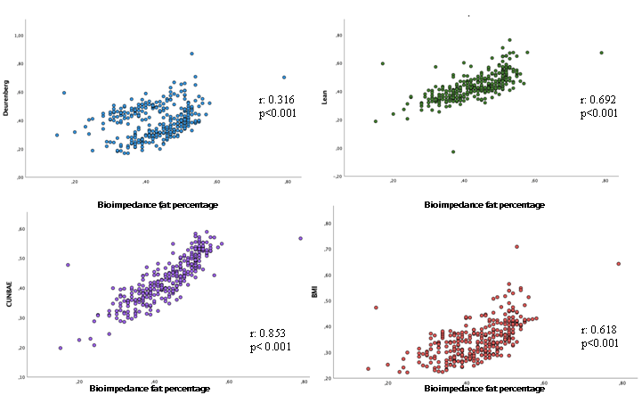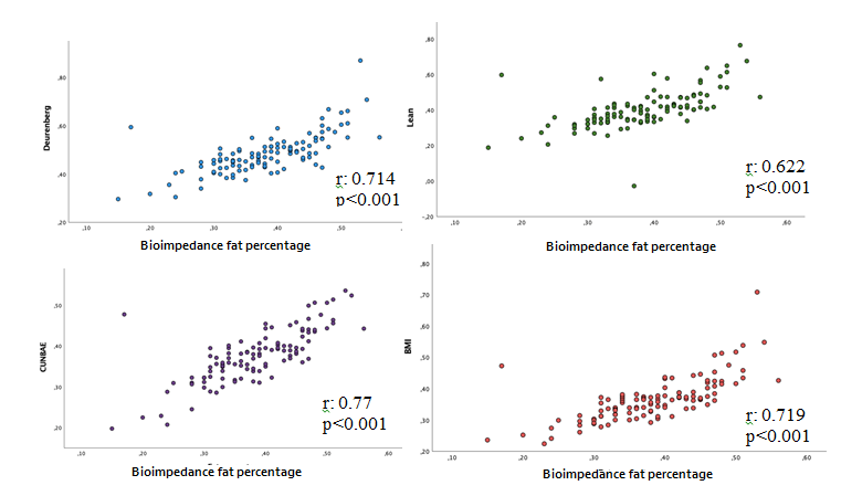 The Pearson correlation index for Deurenberg’s formula was 0.71, for men and 0.816 for women. For Lean’s formula was 0.622 for men and 0.701 for women, and for CUN BAE’s formula 0.77for men, and 0.856 for women. All of them with estatistical significance (p<0.001). For the W/H was 0.702 (p<0.001) for men and 0.681 (p<0.001) for women, and for the average of the three formulas was 0.73 (p<0.001) for men and 0.828 (p<0.001) for women.