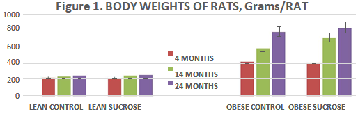 Figure 1 Body weight of Rats. Data are grams per rat. Lean Control fed rats expressed on the three bars on the left at 4, 14, and 24 months of age, followed by the next 3 bars fed the 3 fed the sucrose supplement from 12 weeks of age (p= n.s.); Obese rats are depicted on the right panels similarly fed at 4, 14 and 24 months of age and fed the sucrose supplement depicted in the far-right bars at 4, 14 and 24 months of age (p=<0.05).