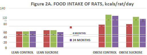 Figure 2 Food Intake of Rats. Data are kcals per rat per day. Lean Control fed rats expressed on the three bars on the left at 4, 14, and 24 months of age, followed by the next 3 bars fed the 3 fed the sucrose supplement from 12 weeks of age (p = n.s.); Obese rats are depicted on the right panels similarly fed at 4, 14 and 24 months of age (p=0.05) and fed the sucrose supplement depicted in the far-right bars at 4, 14 and 24 months of age (p=<0.05).