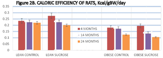 Energy intake of animals is depicted in Figure 2 (A) and indicates that energy intake of obese animals was consistently greater in obese than in lean animals throughout the study, weather expressed in absolute terms as kcals/rat/day or relative to body weight as caloric efficiency. In lean animals, the sucrose supplement was without significant effect on total caloric intake or caloric efficiency (Figure 2 (B)) at all ages studied, except for a minor decrease in caloric efficiency in lean sucrose-fed animals at 4 months of age of animals, early in the supplemental feeding regimen. In the obese phenotype, total energy intake was significantly greater than in lean animals at all ages studied. Sucrose supplementation had little if any effect on total energy intake in the obese phenotype. Caloric efficiency (CE) was computed by determining kcal of energy consumed per animal per day divided by the grams body weight of the animal and expressed as a fraction as reported by Vedula et al.41 CE remained relatively stable in lean control animals at all ages studied. CE decreased as reflected by a higher numerical value at the 14 months age in lean animals as expected following introduction of the sucrose supplement and returned toward normal control levels thereafter. In contrast, CE of obese animals was greater, indicated by a lower numerical value initially and continued to increase a reflected by numerically lower values progressively thereafter. Sucrose feeding was suggestive of a modest blip at the onset of the study, but the values tended to deteriorate more rapidly thereafter to less than half the values recorded for lean animals by the end of the study (Figure 2 (B), Right panel p=<0.05).