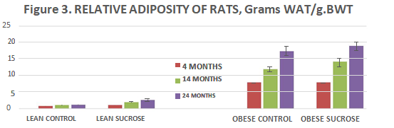 Figure 3 Relative Adiposity of Rats. Data are grams Dorsal plus Retroperitoneal Adipose tissue per gram Body Weight per rat, Lean Control fed rats expressed on the three bars on the left at 4, 14, and 24 months of age, followed by the next 3 bars fed the 3 fed the sucrose supplement from 12 weeks of age; Lean control rats are similar at all ages (p-n.s.) while in lean sucrose fed rats WAT weight increased at each age (p=<0.05). Obese rats are depicted on the right panels similarly fed at 4, 14 and 24 months of age and fed the sucrose supplement depicted in the far-right bars at 4, 14 and 24 months of age and the WAT weights progressively increased at each age studied at each age in both dietary regimens (p=0.01).