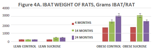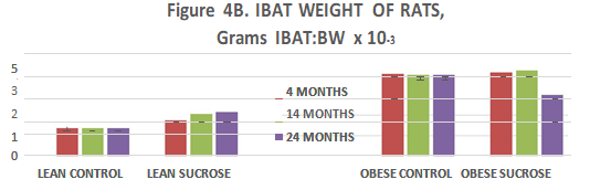 Figure 4 (B) IBAT weights of Rats Relative to Body Weight of Rats. Data are grams IBAT per gram body weight rat x 100, Lean Control fed rats expressed on the three bars on the left at 4, 14, and 24 months of age and are similar at all ages studied (p=n.s.), followed by the next 3 bars fed the 3 fed the sucrose supplement from 12 weeks of age and indicate that the IBAT increases as a proportion of body weight at each age (p=<0.05); Obese rats are depicted on the right panels similarly fed at 4, 14 and 24 months of age and fed the sucrose supplement depicted in the far right bars at 4, 14 and 24 months of age and indicate that the proportion of IBAT is greater than in lean rats at all ages studied (phenotype effect, p=<0.05) but remains proportionately similar to body weight at all ages studied.