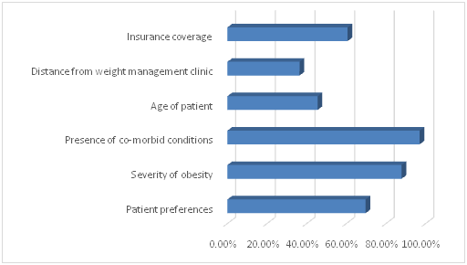 More than half of the PCPs reported that access was a barrier to referral. This coincides with multiple studies reviewed in this paper.4,29 Seventy three percent of PCPs in this study reported accessibility to appointments being an important practice factor for referrals. A potential solution would be to open satellite locations in addition to the main location. Satellite locations could be closer to transportation facilities, such a bus stops or train stations. Also in areas of lower socioeconomic status, as these individuals typically struggle with transportation. Cost of the program was not as significant as a barrier compared to access. About 20% of PCPs reported cost to be a concern. Although, 61% reported insurance coverage as an important patient factor for referral. Per the literature, weight management programs are more expensive34 and are poorly reimbursed.4 It does not appear that cost is affecting referral rates, although insurance coverage seems to pose an issue. With the increasing number of overweight and obese individuals, PCPs may view specialized treatment as more important than cost of treatment. Also with the rise of overweight and obesity and corresponding comorbidities, insurance companies should be more on board with patients seeking care.