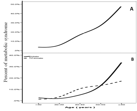Main results: Of the 396 participants analyzed, 158 (39.9%) were male and 238 (60.1%) were female. Age was 51.6±16.3 (minimum 20years and maximum 98 years). MetS was present in 198 cases (50.0%) where 89 (44.9%) were male and 109 (55.1%) were female with female to male ratio 1.2:1, P=0.04. Patients were significantly older in MetS patients 58.1±14.0 vs. 44.9±15.6 respectively, p<0.0001. BMI was not significantly higher in females than males with MetS patients (22.9±1.5 vs. 22.6±1.7 respectively, p<0.0001). Patients with HbA1c>5.6 or Type 2 diabetes mellitus were 4-fold to possess MetS [OR=4.9; 95% confidence interval [CI]=3.2, 7.4, (p<0.0001)], or have elevated plasma TG levels (OR=2.6; 95% CI=2.2, 3.1, p<0.0001) and were also more likely to have low levels of HDL (OR=2.4; 95% CI=2.0, 3.0, p<0.0001). The frequency of MetS is consistently increasing with increasing age until the sixth decade. MetS is more frequent in male at the age group (≥60 years). The frequency of MetS is consistently increasing with increasing BMI with male predominant. The mean of BMI among MetS is not statistically significant positively correlated with increasing with advanced age (r= 0.1, p=0.4).