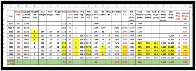 Results: From the period of 2013-2018, he has reduced his weight from 220 lbs. to 167 lbs., waistline from 44” to 32”, and BMI from 33.1 (obese) to 24.7 (normal). Based on his acquired knowledge, he developed AI-based prediction tools to reduce his average glucose value from 279mg/dL to 116mg/dL, A1C from 10% to 6.5%. Since 2016, his hypertension and hyperlipidemia are no longer health concerns along with dropping his cardiovascular risk from 74% to 31%.