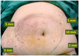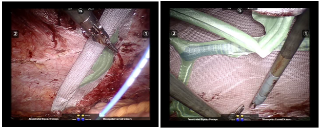 A left lateral approach is our usual technique both for a laparoscopic or a robotic repair. For the robotic procedure, the robot has to be positioned on the opposite side, ie on patient’s right in order to have correct ergonomy in the OR. Initial incision of 1 cm is usually extended by a few millimeters, especially in obese patients, because an open (Hasson) access to the abdomen is rather cumbersome. An opti-view trocar has been used in the past by the authors, but today it is avoided, especially in cases where abundant adhesions and altered anatomy is anticipated. After induction of the pneumoperitoneum, two 5mm trocars are inserted proximally and caudally to the camera port, along the midclavicular line (Figure 1). Adhesiolysis usually begins with greater omentum stuck on the anterior abdominal wall and then continues with the small bowel loops, especially if they are part of hernial sac content. Care is mandatory here, in order to minimize use of cautery, especially monopolar, to avoid bowel injury. Robotic stereoscopic 3D vision has been found by the authors to facilitate this challenging phase of the procedure. If bowel is injured during adhesiolysis, the authors prefer to repair the damage at the same time, rather than leaving it untreated for later. A serious perforation should raise the decision for conversion to laparotomy as well as avoiding the use of mesh. Sharp dissection is usually used with cutting down the adhesions by means of monopolar scissors. For blunt dissection the authors prefer to use a sponge held at the tip of a laparoscopic or robotic grasper (Figure 2). After completion of adhesiolysis and reduction of hernia content, a mesh is inserted and expanded with the help of assisting trocars. Self-expanding meshes (Figure 3) are quite practical in case of very large or multiple defects, because technical difficulty has been found to be proportional to the size of the defect and the necessary mesh. Fixation of the mesh takes place with absorbable or non-absorbable material. We usually avoid the use of drains. An exception was made for one of our cases with synchronous sleeve gastrectomy, where we used both an intraabdominal Jackson-Pratt suction drain, as well as a subcutaneous Redivac suction drain in the area of a very large umbilical hernia repair with excellent results. A patient with flank hernia was treated by extraperitoneal placement of a self-adherent mesh after extended dissection of the right lateral peritoneum.