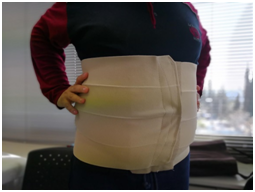 All eight patients followed an uncomplicated course. Patients were discharged as soon as bowel function was restored (postoperative days 2-4). Seromas developed in four patients and were treated by aspiration of the collections in one or many outpatient visits. In our patient with BMI 47, an infection of the camera port site was noted on postoperative day 7, and was drained succesfully on an outpatient basis. All ventral hernia patients were instructed to use a truss in the upright position, for one month postoperatively (Figure 4). All patients declared satisfied with their hernia repair; mean satisfaction rate of 9,375 out of 10 (Figure 5).