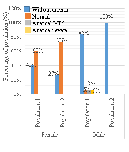 Hemoglobin: According to the World Health Organization, anemia affects 1.62 million people globally, corresponding to 24.8% of the world population.26 In this study of women, 60% from population 1 and 73% from population 2 presented mild anemia. In men in population 1, 5% had mild anemia, 5% moderate anemia and 5% severe anemia. Noman from population 2 was found to have anemia.
