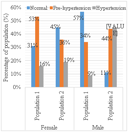 Hypertension: The average systolic pressure values (mmHg) of women in populations 1 and 2 were 121.89±21.34 and 124.90±11.99 and diastolic pressure (mmHg) were 76.22±12.66 and 78.63±6.15 respectively. For men, averages of systolic pressure (mmHg) in populations 1 and 2 were 122.48±10.92 and 131.33±14.06 and diastolic pressure (mmHg) were 79.28±8.12 and 88.33±10.73 respectively. For both cases, population 2 presented the largest values in both the systole and diastole.