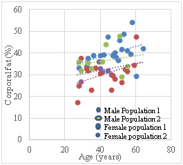 Unfortunately, there is still no consensus on how body fat is related to morbidity and mortality due to the absence of appropriate prospective studies. Figure 10 shows the relationship between age and body fat percentage, identifying a clear increasing trend in body fat as people increase in age. This pattern was the same for the four groups evaluated.