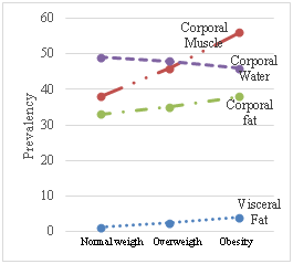 The fat and lean components of the body, including the percentage of visceral fat, muscle mass, body water and quality of cellular life are closely linked to obesity, aging and chronic diseases with subsequent morbidity and mortality.13 Recent technological progress allows the quick and accurate evaluation of the global body composition thanks to bioelectrical impedance. The primary objective of the study was to evaluate the metabolic state through the values of hemoglobin, cholesterol, blood glucose and blood pressure and its correlation with the percentage of visceral fat, muscle mass, body water, and cellular quality of life in two Honduran populations that are actively employed.