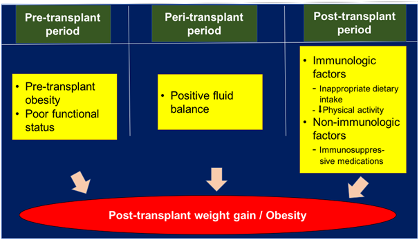 Unlike per-transplant period, weight gain during the post-transplant period is generally persist unless factors contributing to weight gain are intervened. These factors including immunologic and non-immunologic factors involve in weight gain and obesity during this period.