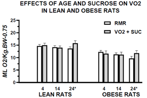 The experimental design of this study was a conventional 2 x 3 x 4 design, with 2 phenotypes (lean and obese), 3 age groups (age range 3 to 28 months; mean age groups 4, 14, and 24 months of age) 4 total study parameters (VO2 at: a) fasting, b) after feeding Purina diet, c) fasting after sucrose, and d) 4 hours after feeding the sucrose liquid supplement). Measures of VO2 were obtained in a Collins Small Animal Respirometer closed circuit apparatus after CO2 removal via a CO2 absorbent. The apparatus was fitted with a one cubic foot volume plexiglass cannister in a closed-circuit system and the measures of oxygen utilization recorded from individual quietly resting animals with a spirometer apparatus (Warren Collins Co, Braintree, MA). All measures of VO2 were taken at 29°C deemed thermal neutrality for the rat as reported elsewhere7 by immersion of the sealed cannister in a closed-circuit system, maintained in a constant temperature circulating water immersion bath throughout the course of the measurements over a period of 30 to 45 minutes approximately 4 to 6 hours after the end of the dark cycle, when rats have been observed to undergo the most active phase of their feeding activity and when it was possible to determine the residual thermic effects of recent post prandial feeding activity. Food and fluid were provided rats ad libitum prior to placement in the cannister, but no food or liquid was provided the animals while resting comfortably in the VO2 cannister. Measures of barometric pressure and altitude of the laboratory were factored into the equation and attempts to keep all environmental conditions constant were rigidly adhered to throughout the study. Measures of VO2 reflective of residual post prandial DIT activity were reported a ML O2/kg body weight-0.75 to allow for differences in body size and mass as described by Klieber and Wang et al.30,31 Weights of animals were recorded to the nearest gram with an Ohaus beam balance (Fisher Scientific) immediately prior to placement of the animal in the VO2 cannister.28 The determination of the Residual Thermic effect of Diet induced thermogenesis (DIT) was determined 4 hours after the last availability of food and was coined the term RDIT. House water was available ad libitum until placement of the animal in the thermogenesis apparatus.