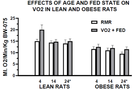 Figure 2 Effects of age group on RMR of lean and obese rats aged 4, 14, or 24 months of age. Data are mean +/- 1 SEM, n= 4 to 8 rats/group. *=incomplete data group, n=4. P=< 0.05 lean vs obese at ages 4, 14 and 24 months. Effect of age were N.S. in lean rats, Effects of age were <0.10 in obese rats.