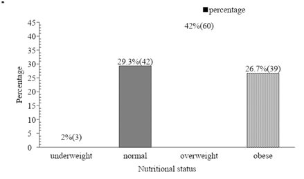According to Asian BMI cut- off 68.7% (99) of females were overweight or obese while remaining were not. The study found that 42% (60) of female were overweight and 26.7% (39) were obese. This prevalence is much greater than the prevalence found in the study done in female living in Ramkot VDC of Kathmandu district where 4.5% were overweight and only 1.8% were obese.12 This could be because the calorie and fat intake of women residing in Rajbiraj is high. Likewise the prevalence is much higher than the prevalence among urban women residing in Chennai of age 20-49 years where 7.9% were found to be overweight and 19.8% were found to be obese.13 According to waist circumference measurement 59% (84) were found to be abdominally obese while 41% (60) were not. The result could be compared to the study done in women visiting TUTH revealed that 82.2% of women were abdominally obese in terms of waist circumference.14 It could be because women visiting TUTH may have any chronic diseases which are the result of being abdominally obese. So, they have comparatively high waist circumference as compared to general reproductive aged female of Rajbiraj. The Figure 1 below shows the prevalence of abdominal obesity in females. Whereas regular intake of dairy products was found to have a significant association with waist circumference measurement. The multivariate analyses s0howed a trend toward increases in weight with high dairy calcium intakes in normal-weight French women (Figure 2).15