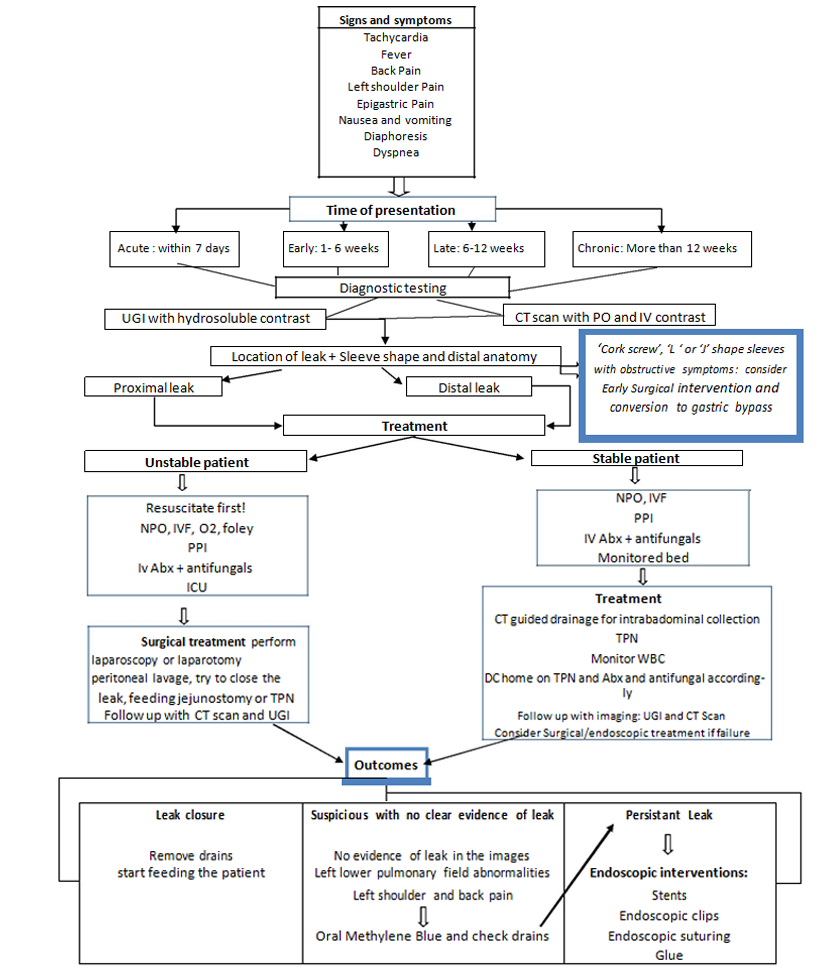 Overall, early recognition and high suspicion for LVSG leak is the first step to successful treatment and prevention of long term morbidity and mortality. Initial recognition should include use of CT scan, upper GI radiologic evaluation and EGD to identify not only the leak but the anatomy of the sleeve.
