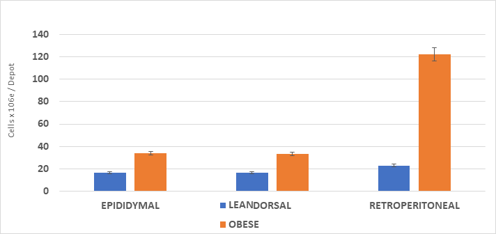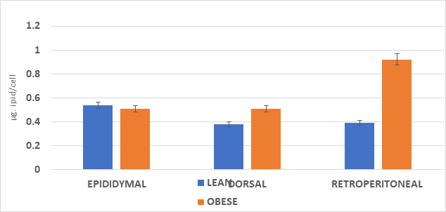 The cellularity of the adipose depots is depicted in Figures 1 & 2 and indicate that the adipocyte lipid content was similar in the epididymal depots of both phenotypes, with only a modest increase in adipocyte number in the obese phenotype. There were significant increases in both cell lipid content and cell number per depot in the dorsal and visceral retroperitoneal depots. In those depots, the greatest increase in both adipocyte lipid content and adipocyte number occurred in the visceral retroperitoneal depot where the depot mass was significantly 15-fold greater than in their lean littermates, the cell numbers/depot were over 5.5-fold greater and the cell lipid content 2.5-fold greater than in their lean littermates. In that depot, the adipocyte lipid content approached the typical maximum of approximately 1.0 to 1.2 µg lipid content per adipocyte sometimes reported for adipocytes of white adipose tissue. Once formed, adipocytes of both types may be retained throughout much of the remaining lifespan, varying only in cellular lipid content once formed.
