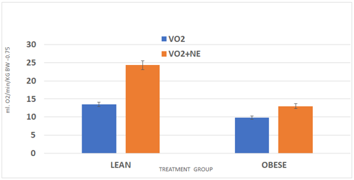 Data are mean ±1 SEM, n= 6 rats/group. P = < 0.01, VO2 vs VO2+NE in lean, p-<0.05 in Obese VO2 vs VO2+NE.