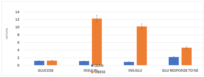 Data are mean ±1 SEM, N= 8 rats/group at 30 weeks of age. Glucose reported as mg/ml; Insulin as ng/ml, and insulin to glucose ratios as the arithmetic computation where insulin is the nominator and glucose the denominator. P = < 0.01 for Lean vs obese for insulin and insulin: glucose ratios. GLU response to NE fold-increase in blood glucose taken one hour after a maximal (200 µg/kg BW) NE subcutaneous injection.