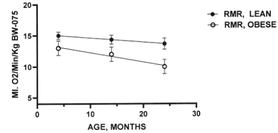 Figure 2 Effects of age and phenotype on RMR of fasting rats. data are mean+/- 1 SEM, n=6-12 rats/group. P=<0.05 for phenotype at 14 weeks, p-<0.01 at 24 months of age.14