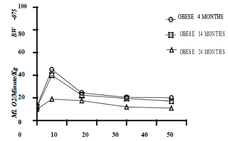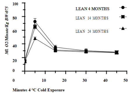 Obesity and mild to moderate impaired carbohydrate tolerance develops in the obese phenotype of the LA/Ntul//-cp (corpulent) rat strain by 6 weeks of age. Groups (n=12-20 rats/phenotype] of female congenic lean and obese LA/Ntul//-cp (corpulent) rats were fed ad libitum standardized Purina #5012 diet ad house water for 4, 14, or 24 months of age. Measures of Body weight (BW) and of resting oxygen consumption (RMR; VO2) at thermal neutrality and for up to 45 minutes of (4°C) spontaneous cold exposure, and norepinephrine-stimulated thermogenesis (100 ug. s.c.) were determined at each age. Body weights of lean rats increased only gradually during the study (p=n.s.), but weights of obese phenotype were ~2-fold greater at 4 months (p=<0.05), 14 months (p-<0.01), and ~3.5 to 4-fold greater at 24 months of age (p=<0.01). Resting metabolic rates in the lean phenotype trended to decrease modestly by 24 months (p=<0.05) and were greater than resting metabolic rates in the obese phenotype at all ages studied (p=<0.05). Cold exposure at 4°C resulted in a dramatic ~5-fold increase in the oxygen consumption after 5 minutes in 4-month-old rats, which subsided to ~2x resting metabolic rate within 15 minutes and remained constant thereafter in the lean phenotype. In 14-months old lean rats the increase in oxygen consumption at 5 minutes averaged ~4-fold increase over resting levels and returned to ~2x resting levels from 15 to 45 minutes 4°C exposure. In 24-month-old lean rats however, the cold induced increases in metabolism were markedly diminished to only ~3x resting metabolic rates at 5 minutes cold exposure but remained similar to the other lean age groups thereafter. In the obese phenotype, the peak responses at 5 minutes were lower than those of lean rats at 5 minutes in 4- and 14-month-old rats and were significantly impaired in 24-month-old rats at all times measured. Norepinephrine resulted in a >1.5-fold increase in oxygen consumption in the lean phenotype at all ages studied, while in obese rats norepinephrine resulted in a~1.4-fold increase in oxygen consumption at 4 months of age with non-significant ~1.1 to 1.2-fold increases at the two older ages. In both phenotypes, the resting and the norepinephrine-stimulated oxygen consumption responses tended to decrease with increasing age. The results of this study demonstrate that the body weights of the obese phenotype are significantly greater than their lean littermates throughout the age spectrum studied, and that both resting metabolic rates, 4°C cold, and norepinephrine-stimulated thermogenesis are decreased in the obese compared to the lean phenotype and become further decreased with advancing age.