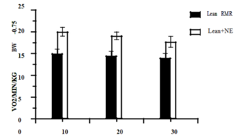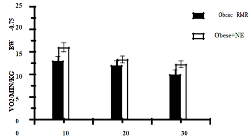 Figure 4 (B) Effect of noradrenaline (NE) on VO2 in Lean (Figure 4 (A)) and obese (Figure 4 (B)) rats, n= 6-12 rats/group. NE administered 100 µg./rat subcutaneous in upper central dorsal area and peak VO2 recorded 15-20 minutes post injection.