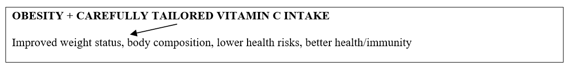 Obesity is not just being overweight. It is a metabolic disorder due to the accumulation of excess dietary calories into visceral fat and the release of high free fatty acid concentrations into that target various organs. Considered to represent a state of chronic oxidative stress and low-grade inflammation whose intermediary molecules may include leptin, adiponectin and cytokines., obesity may progress to hyperglycemia, and possibly to type 2 diabetes, and obesity exacerbation,47 especially in the face of a persistent deficit in desirable plasma levels of vitamin C.4