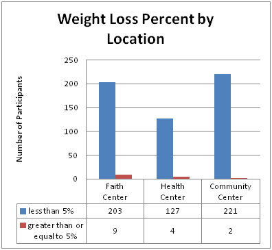 There was no significant difference in the weight change between the three groups using mean weight loss in pounds (p = 0.058), mean weight loss percent (p = 0.059) and by category of weight loss percent < 5% or ≥5% (p = 0.391) with very few actually losing ≥5% of their initial body weight (Figure 1). After adjusting for sex, class size, race, baseline BMI, and education, we found a significant difference in mean weight loss in pounds by type of location (p =0 .002). Similarly, after adjusting for confounders, the mean weight loss percent was also significant (p = 0.001). We used a Bonferroni Adjustment to correct for multiple comparisons which indicated that the only significant difference for weight loss was Health Centers, whose participants lost significantly more pounds compared with Community Center based groups and lost significantly higher percentage of body weight compared with Faith Center groups. Adjusting for confounders did not significantly change the difference in category of weight loss percent. Using the intention to treat approach weight loss percent remained statistically significant among different groups (p= 0.005) and weight loss in pounds became non-significant (p=0.059) (Table 2 & 3). The difference in category of weight loss percent among location types remained non-significant (Chi 3.359 p=0.187).