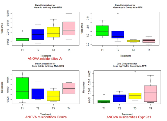 The following box plots indicate there exists variance heteroscedasticity across different treatment groups. This means that the PCA-F test gives more convincing conclusions when testing the mean difference. Furthermore, the ANOVA fails to identify quite a few of significant genes.