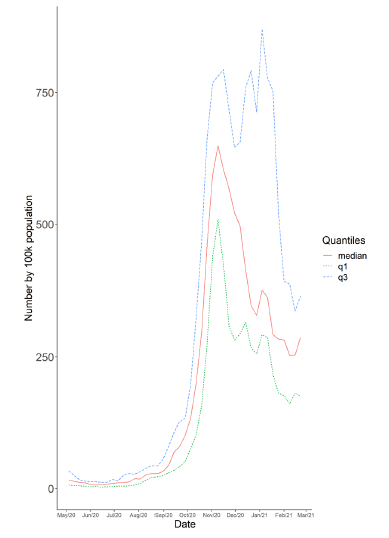 The second subperiod spans from September to November 2020, when the median reaches its absolute maximum. From this month onwards, the median of the indicator decreases, with a slight recovery during January 2021. But this last behaviour is not typical for countries with the worst performance on new cases rates. These, represented by the third quartile, reach two high peaks in December 2020 and January 2021 (the last one being the highest) before dropping steeply. Figure 3, representing the median first derivative (more precisely the derivative of a spline of the time series), also illustrates the evolution of new cases rates. When the new cases increase (derivate positive) or decrease (derivate negative), they change at a rate that can be detected visually by the line's steepness representing the derivative. Its value becomes positive even before August 2020 and increases very sharply until late October 2020. Afterwards, it decreases rapidly with fluctuations until late December 2020. After the beginning of 2021, it also increases with instabilities.