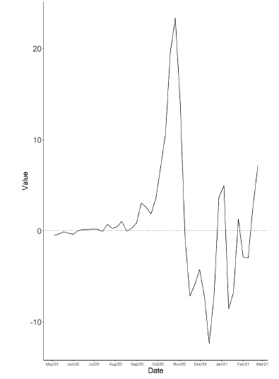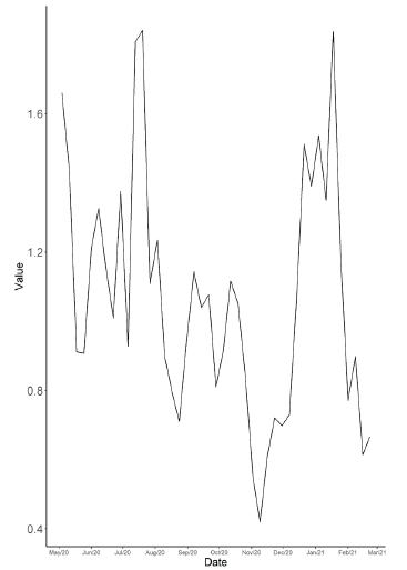 As stated before, the period under analysis spans between the 19th week of 2020 and the 8th week of 2021, more precisely from May 4, 2020, to February 22, 2021. Each time point corresponds to one week, and thus 43 weeks have been analysed.