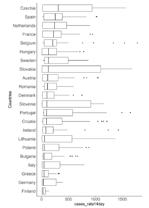 Most of the distributions of cases rates by country are asymmetric positive because half of the data points have relatively low and similar values for each country. This asymmetry results from the difference between two periods: the first with low and the second with high values.