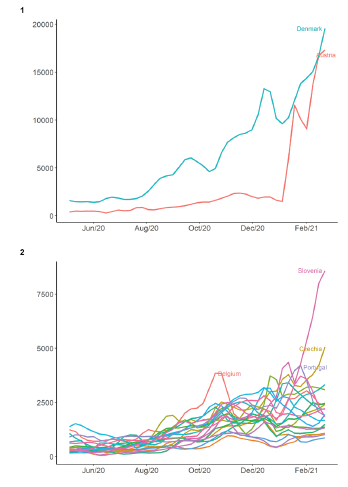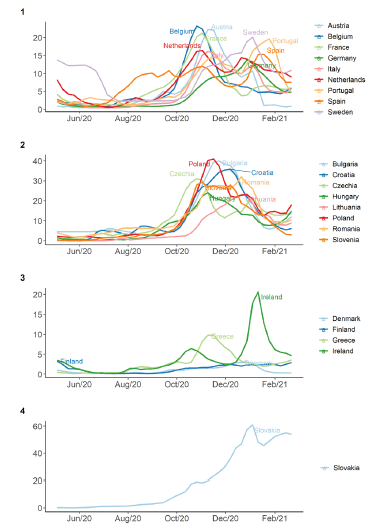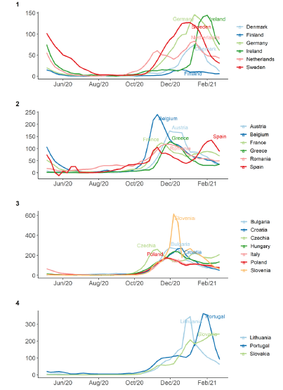 3 - However, the third wave took on very different intensities among the EU countries over the whole period under study. Some countries reached a peak in the last weeks of December 2020, and others, with greater severity, during the last month of January 2021, are also under the increasing influence of the alpha variant from the United Kingdom.
