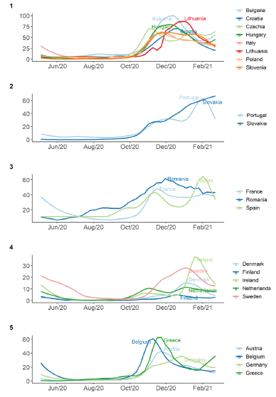 For the new cases indicator, five groups of countries were identified (Figure 4):