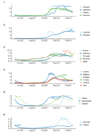 These trajectories make it possible to identify different country profiles throughout the successive pandemic waves and counter-cyclical behaviours, partly explained by the insufficient harmonisation of public policies to tackle the pandemic within the EU.