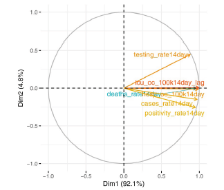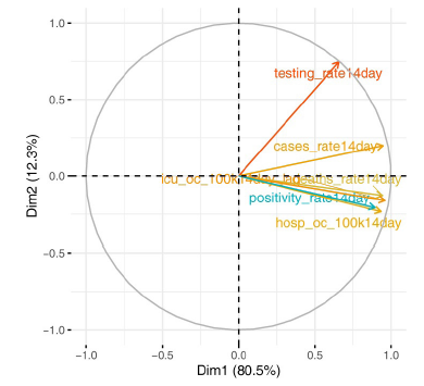 Complementarily, the second factor opposes variable "Test rate" to variables "Positivity rate" and hospital admissions, explained by the fact that more intense testing strategies tend to identify more positive cases, albeit in a smaller percentage. Therefore, the second factor essentially assesses the relative "intensity of testing" carried out by countries over the period under study.