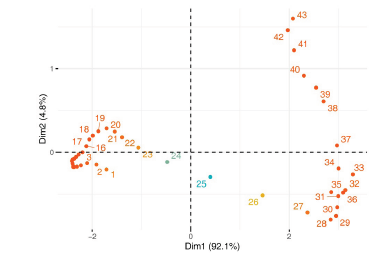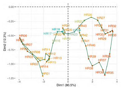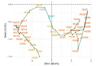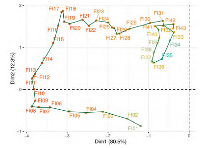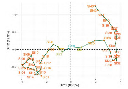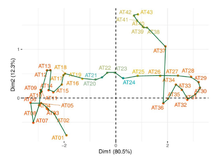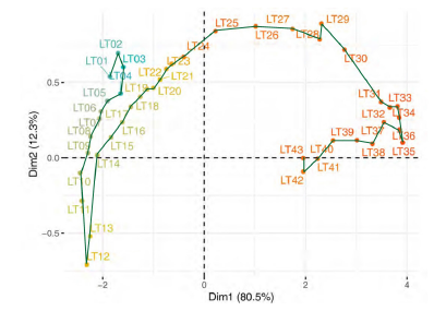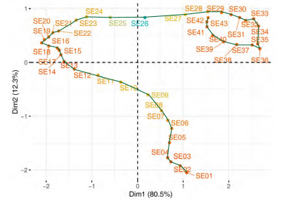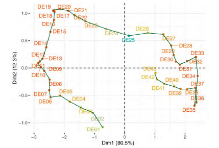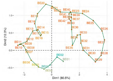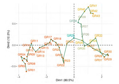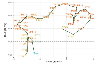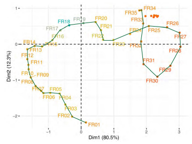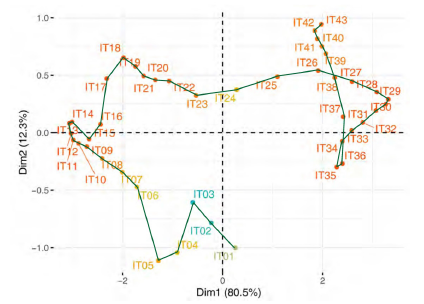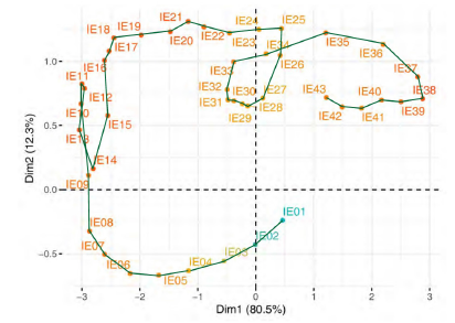 The second step of this multivariate three-way data analysis provides a common space of joint representation of the 43 time periods (intrastructure), based on an optimised criterion (compromise), which maximises the global projected inertia. This makes it possible to characterise the projection space to represent the pandemic trajectory graphically for each country in relation to the global mean rank behaviour in relation to the centre of gravity of the joint table.
