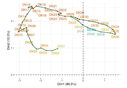 The statistical approach (intrastructure) will provide a representation of COVID-19 incidence of each European country along the predefined global period. These representations on the first factorial plane are relative rank trajectories of countries pandemic.