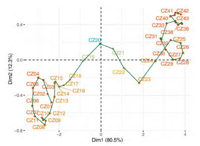 The first step of this multivariate method (interstructure) consists of a statistical analysis of the global evolution of the pandemic over time. Standardised principal components are considered, where "objects" are the centres of gravity of countries' clusters associated with each table , where n is the number of countries, p is the number of variables previously selected and t the time period . A Euclidean image of 43 tables on a lower dimension space is thus obtained. Generally, the first principal factorial plane explains quite well the evolution of such centres of gravity over time, describing the global evolution of countries' COVID-19 incidence from May 2020 until Mars 2021.
