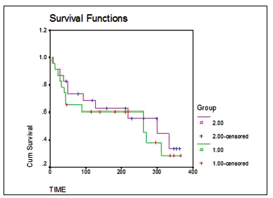 The most commonly known test is a Mantel-Haenszel, or log-rank test, proposed firstly by Mantel in 1966 and then by Cox in 1972. As the result, some researhers refer to the procedure as to the Cox-Mantel test.12 The test determines the difference between expected and observed number of events in participants of two groups. The test statistic is denoted as Q and distributed as . İt should be noted that the tests are powerful for stratified 2 x 2 tables, and when the number of groups is larger, the pairwise comparison of the hazard rates is carried out.12 The hazard ratio is an estimate of the hazard rate in the one group relative to the hazard rate in the other group.5 If the hazards are proportional, then the ratio will be constant at any interval of time. For example, if the risks of an event for individuals of the one group were twice higher than the hazards in another group at any point of time, the risks of an event would differ double at early or later times as well.12 Does it mean that we should find the hazard ratio for all individuals during the whole study period and then compare them at different points? İndeed we may do it in a short-term study, but the task is an arduous if there are too many time interval.1,13 The log-rank test has a very important assumption of proportional hazards to examine. İn a such situation the estimation of survival curves is very useful; one says that if the curves are parallel of the same shape the hazard ratio is constant and logrank test results are reliable.